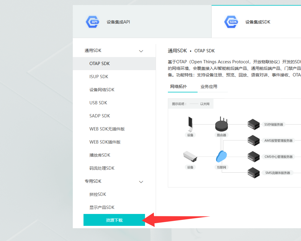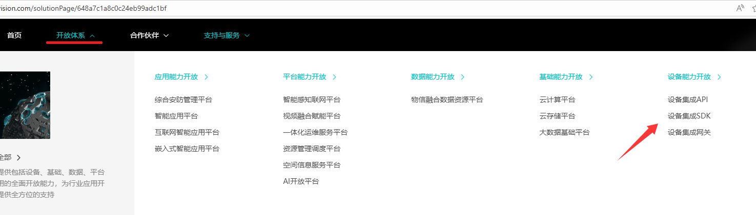 点开【开放体系】菜单,点击【设备集成SDK】。
