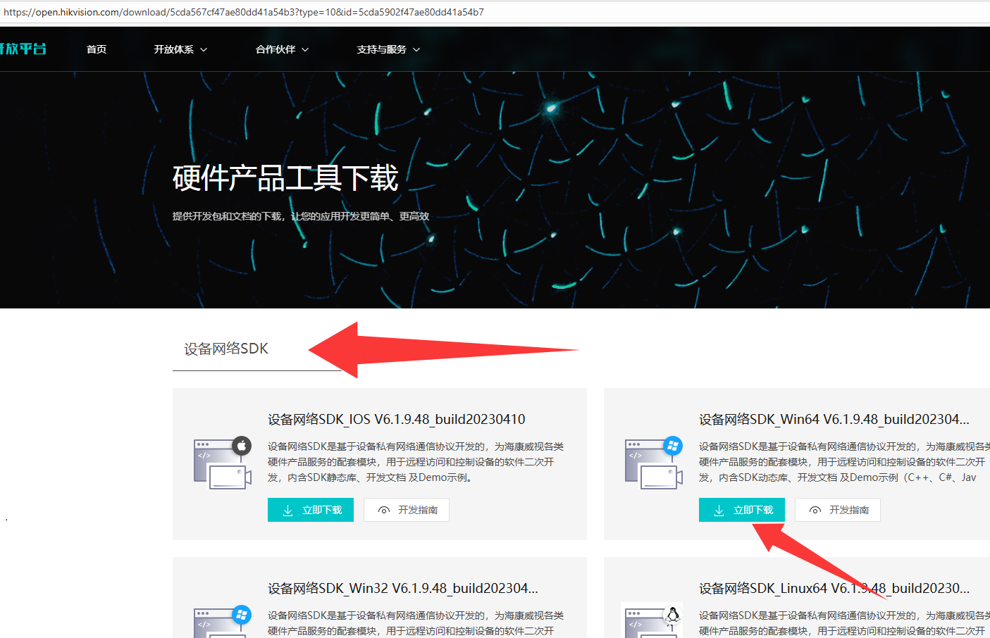 选择【设备网络SDK】,并下载【设备网络SDK_Win64 V6.1.9.48_build20230410】。